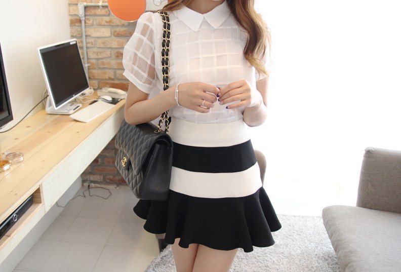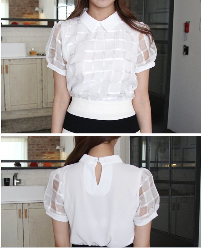 韩国女装网店代销 浪漫透肤网纱格子衬衫
