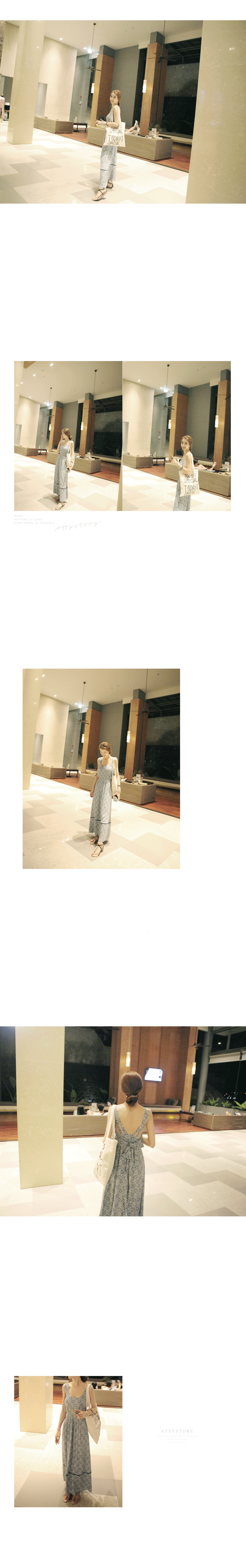 韩国代购 attystory蝴蝶结性感露背民俗图腾连衣长裙(2色)