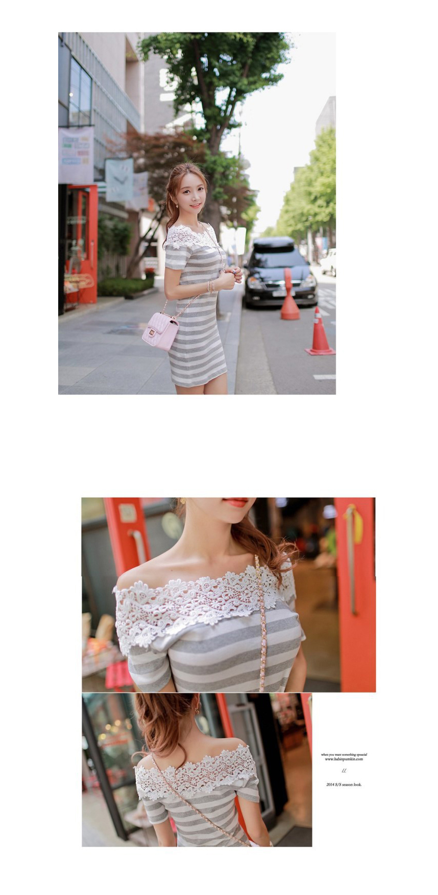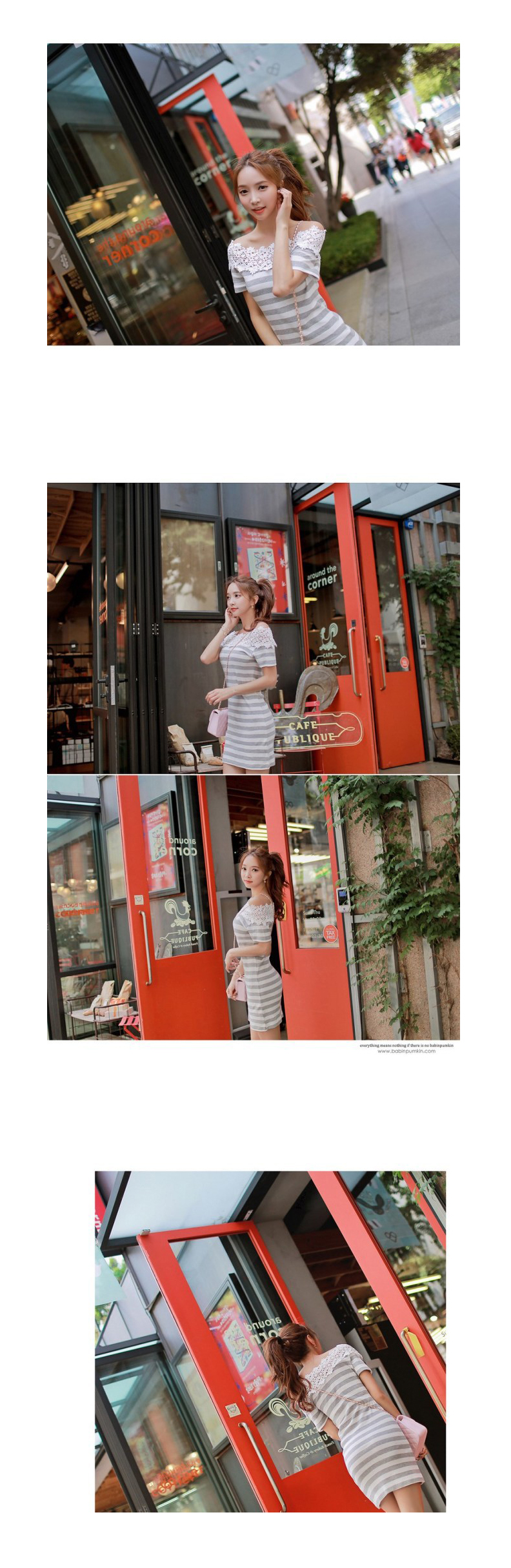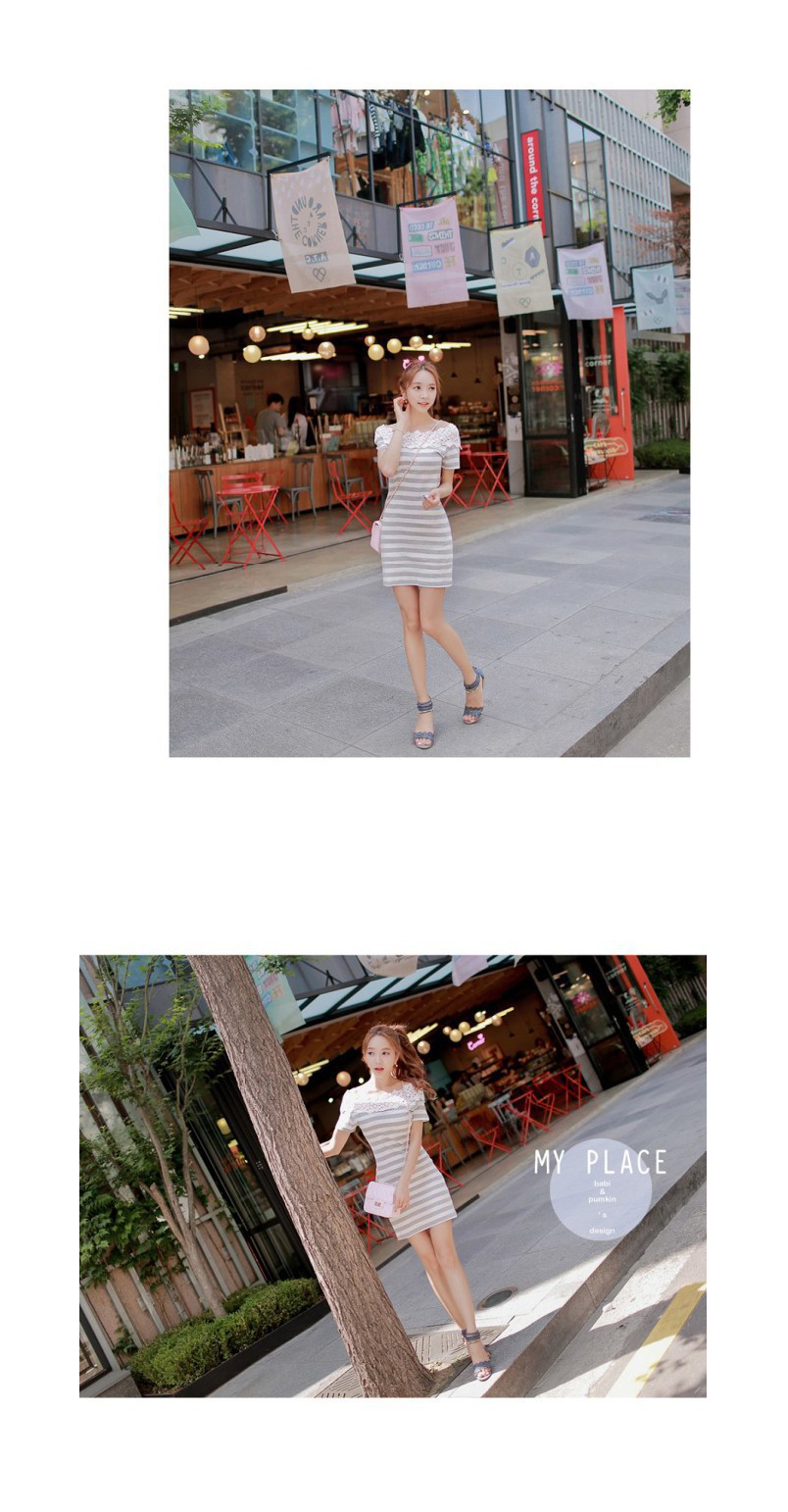 韩国女装品牌代理 babinpumkin勾花镂空修身条纹连衣裙