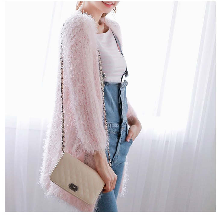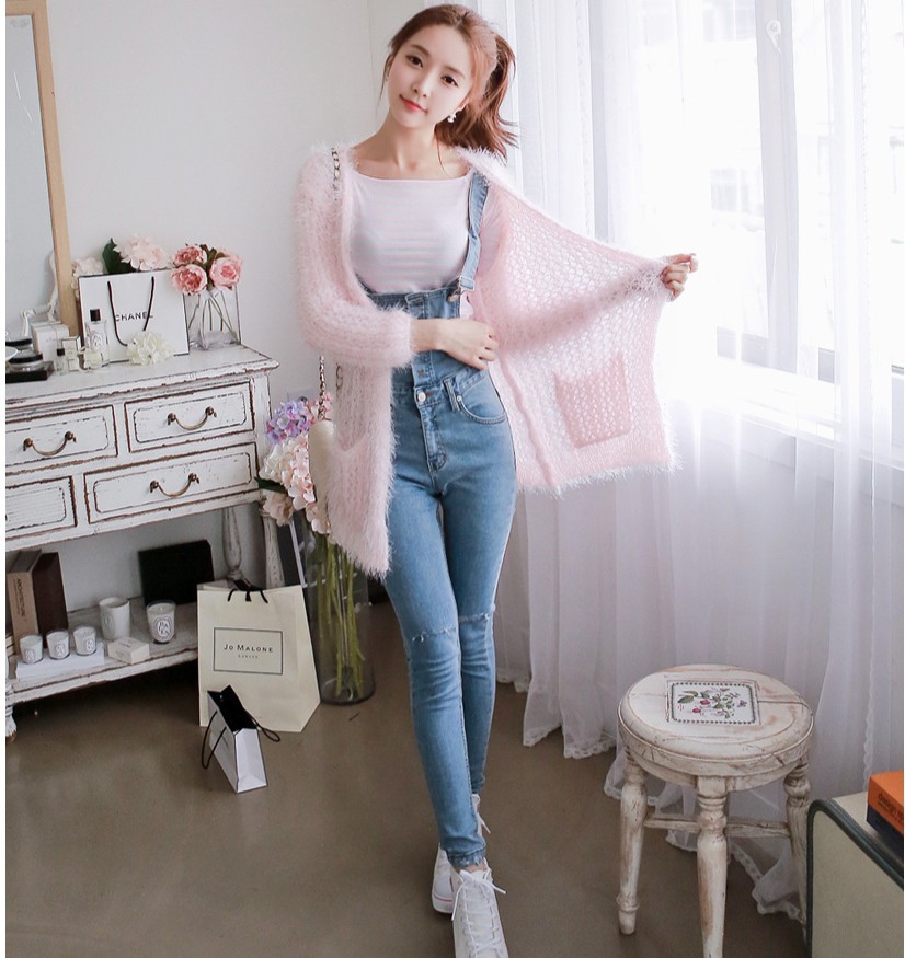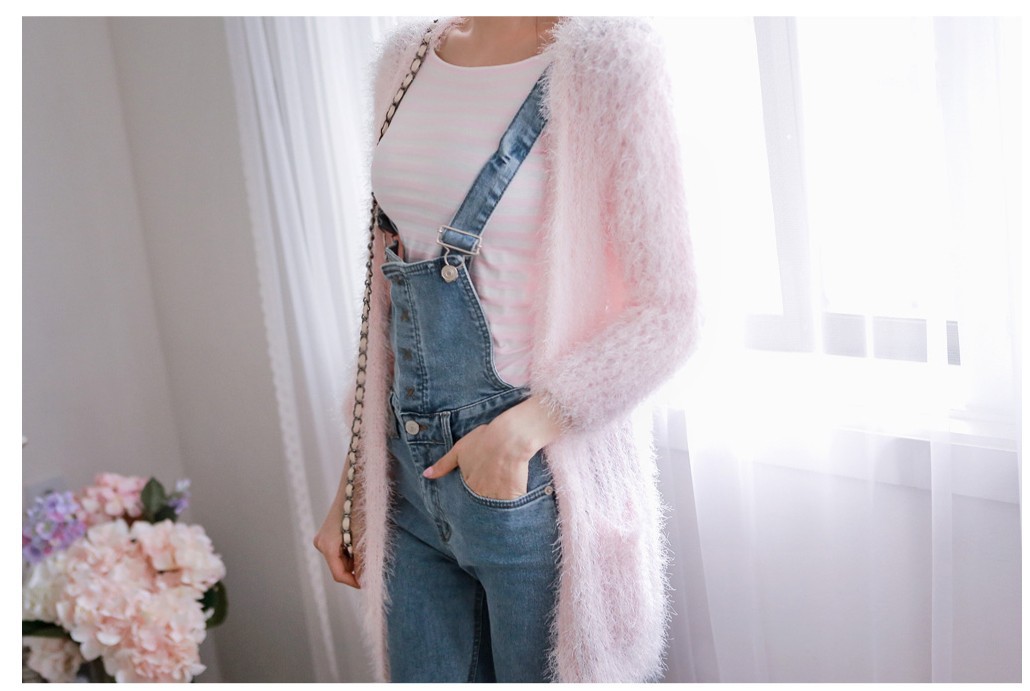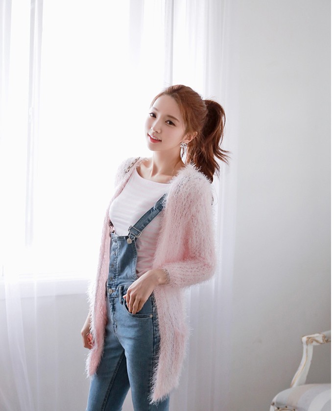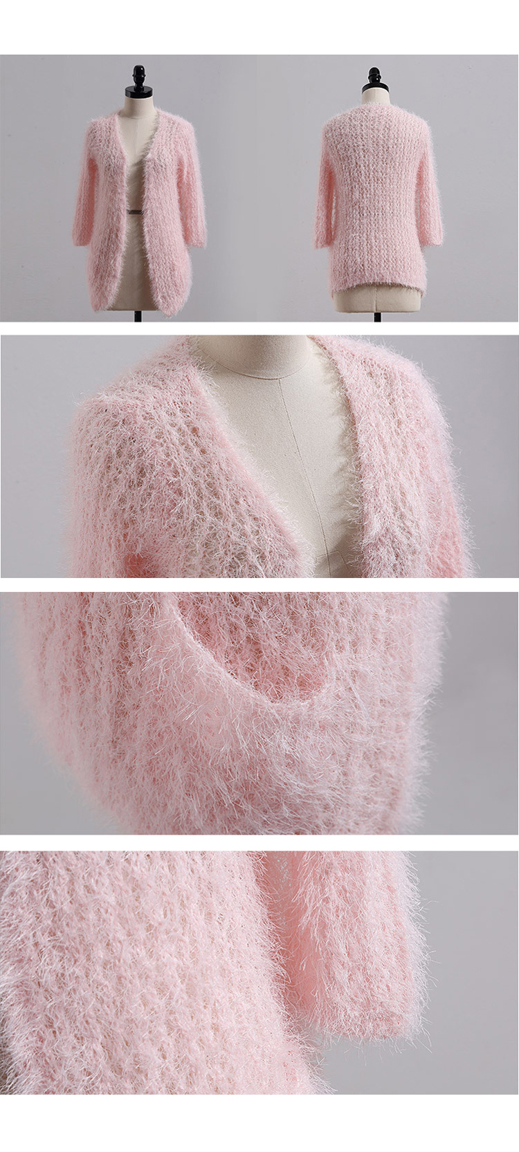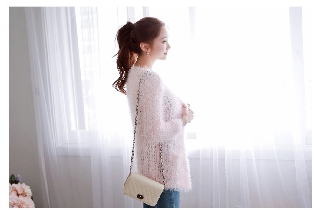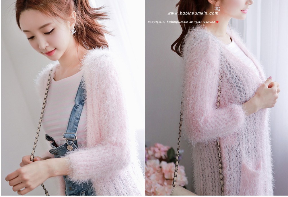 韩国服饰2014秋冬新款 babinpumkin粉色毛绒针织开衫