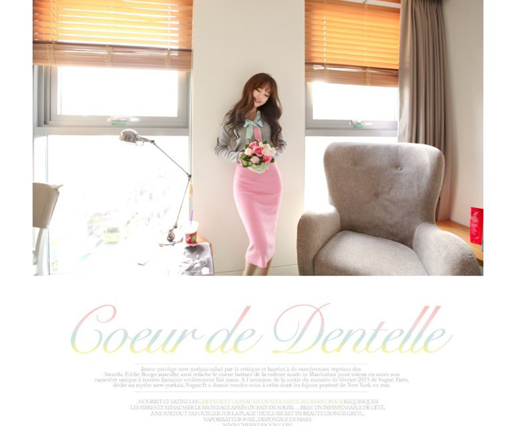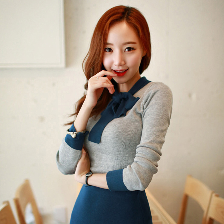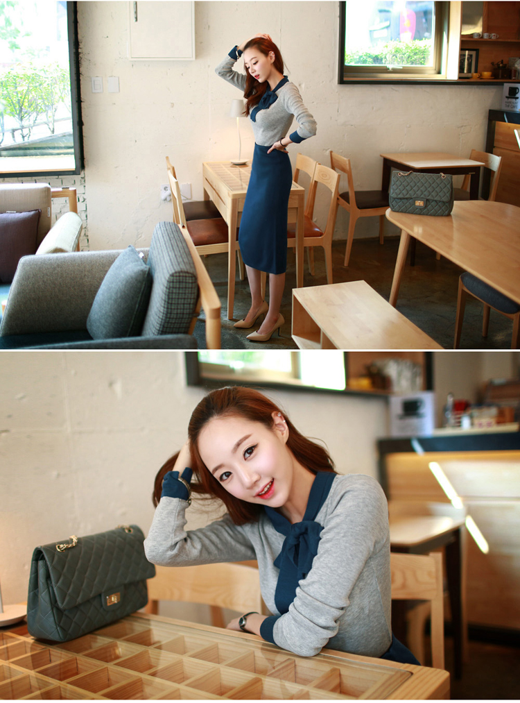 cherry-spoon法式赫本风蝴蝶结拼色套装(上衣+包臀中裙)2色