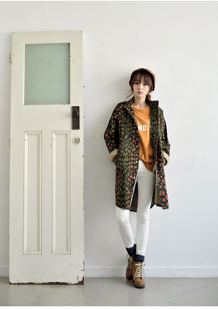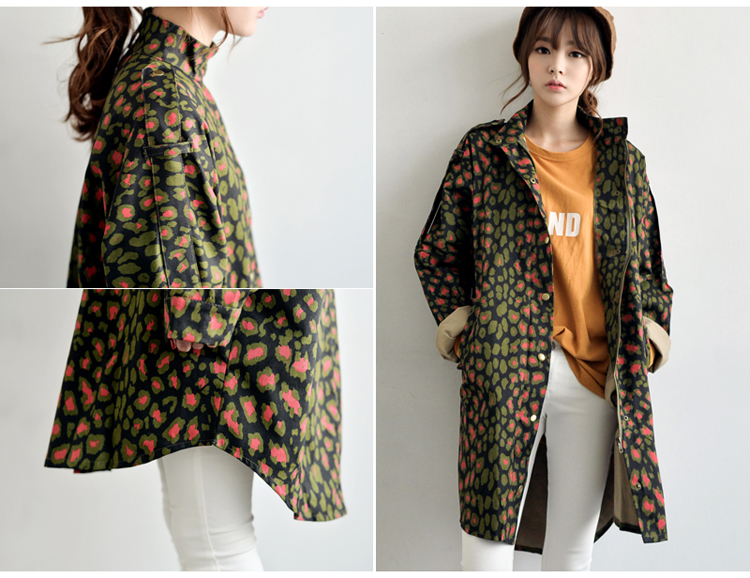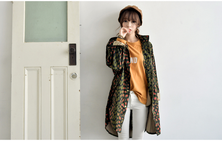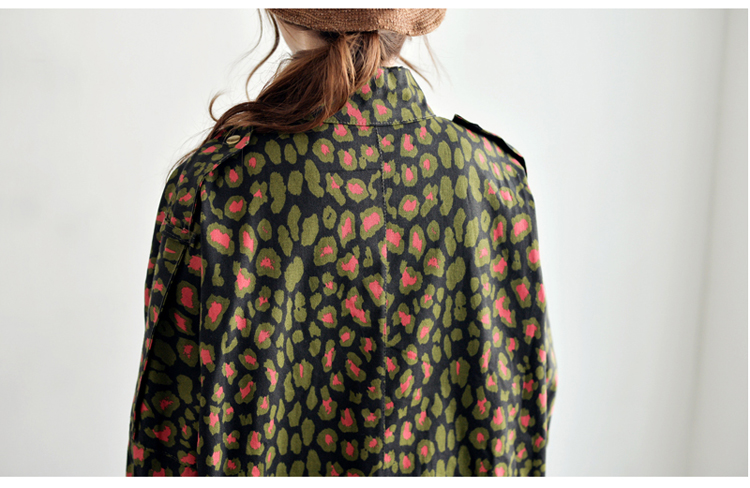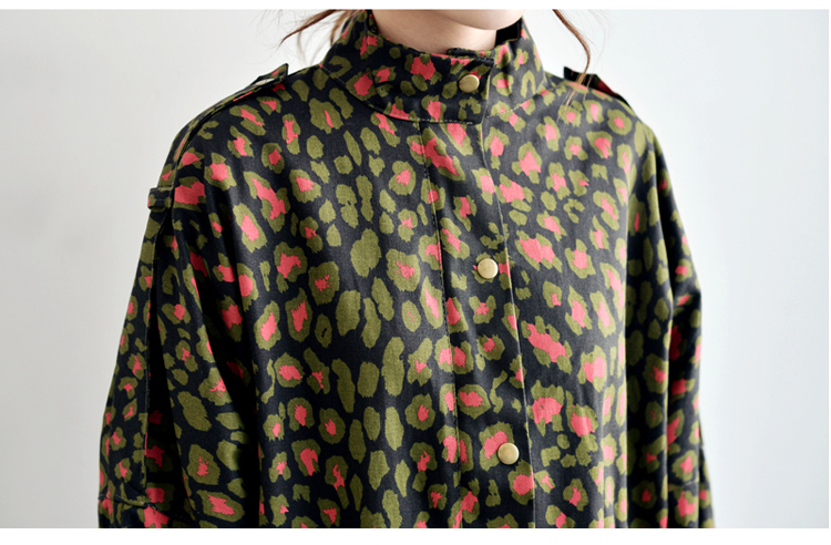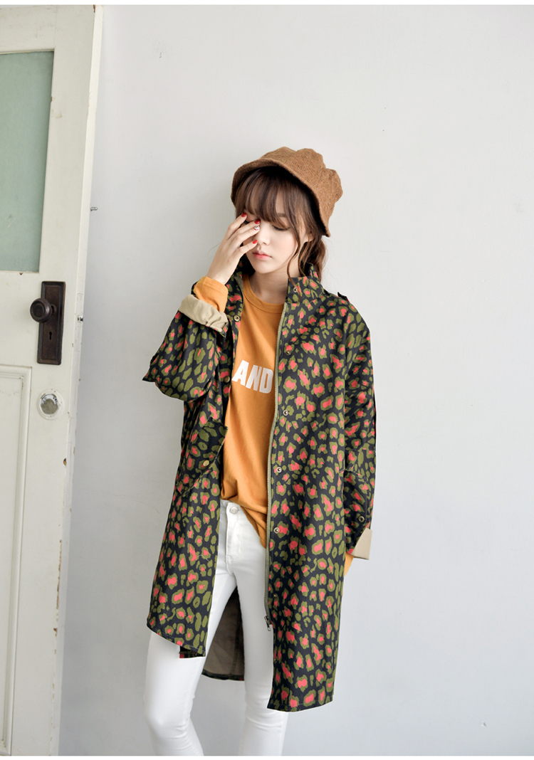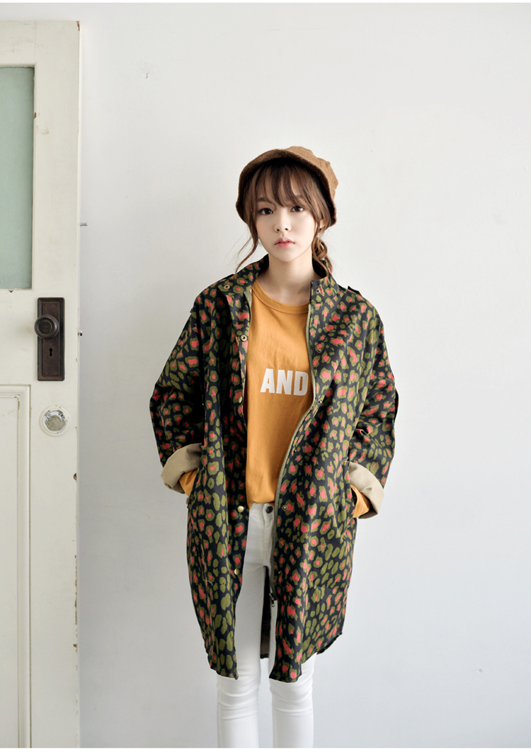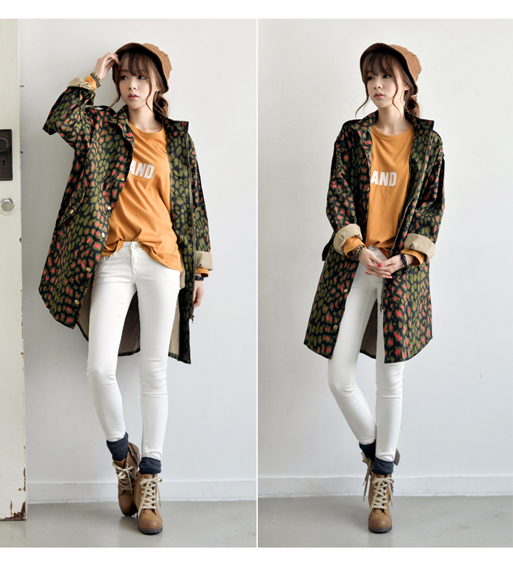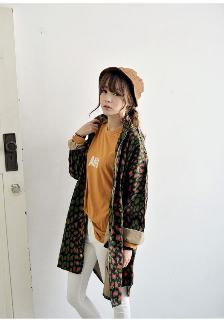 韩国女装网店代销 just-one街拍风撞色豹纹长款风衣
