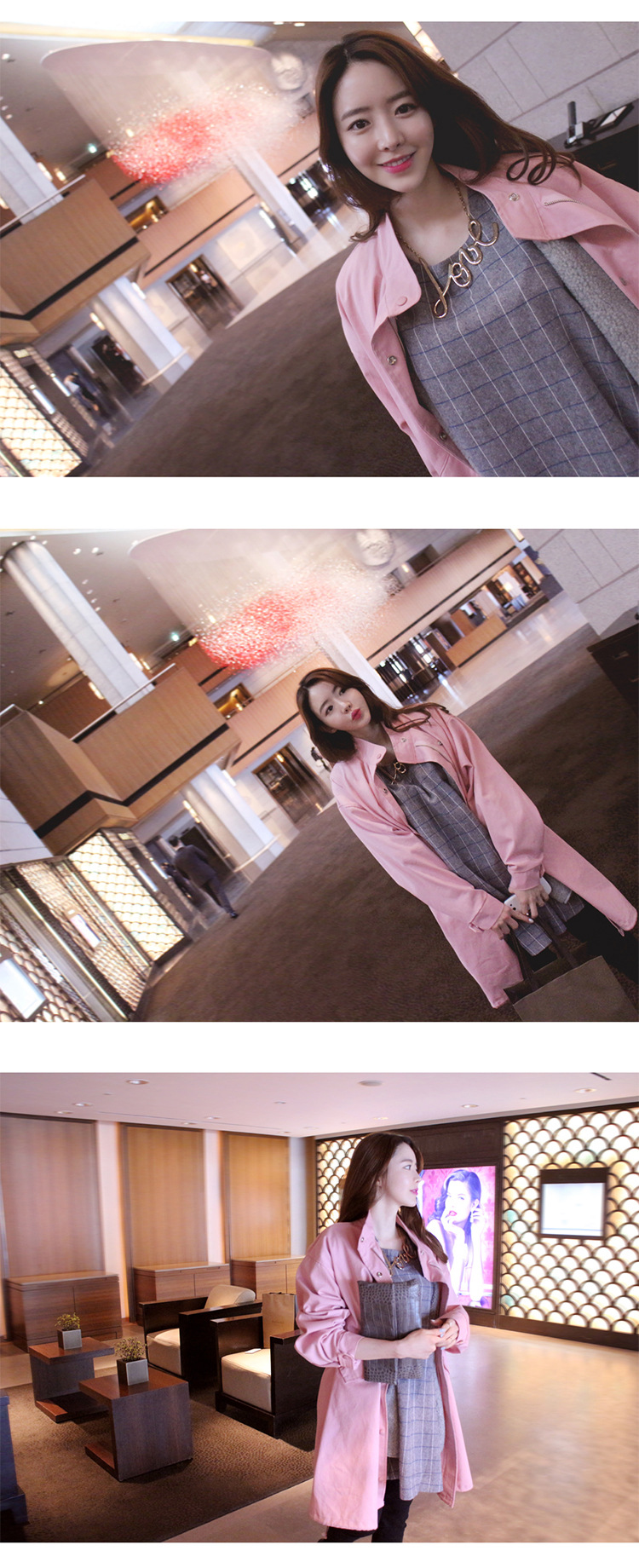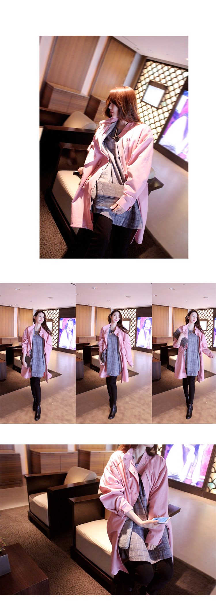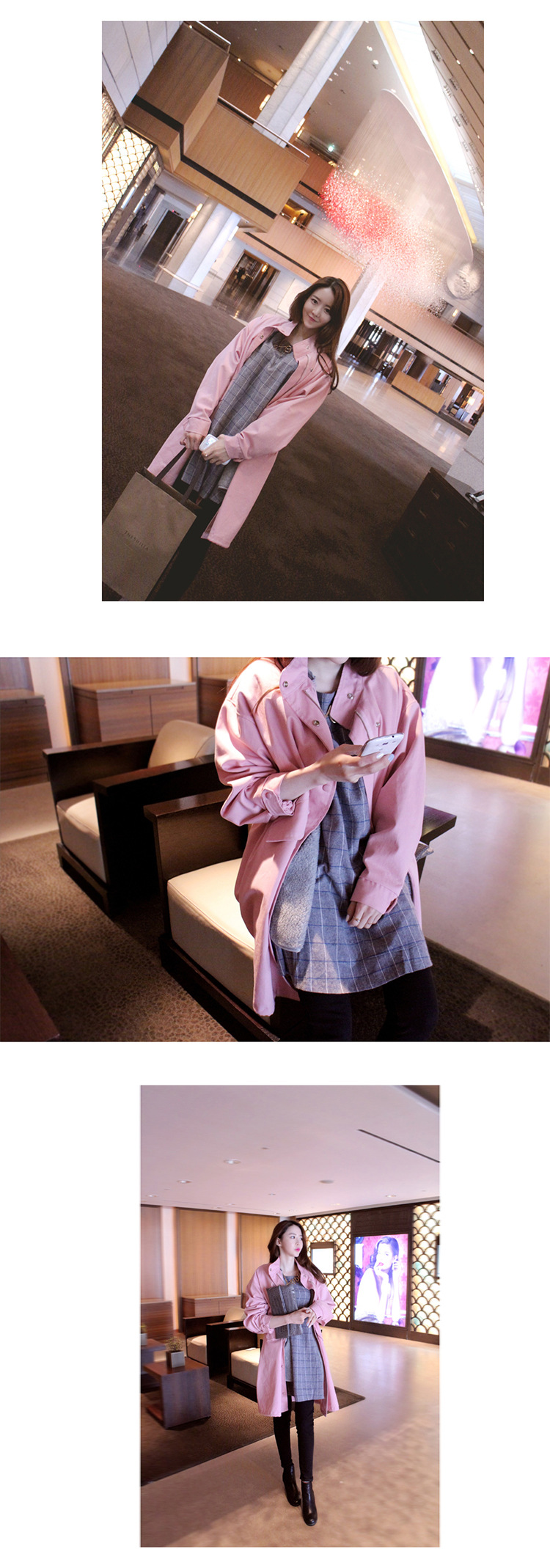 韩国女装网店代销 bubbleandchic宽松长款粉色风衣